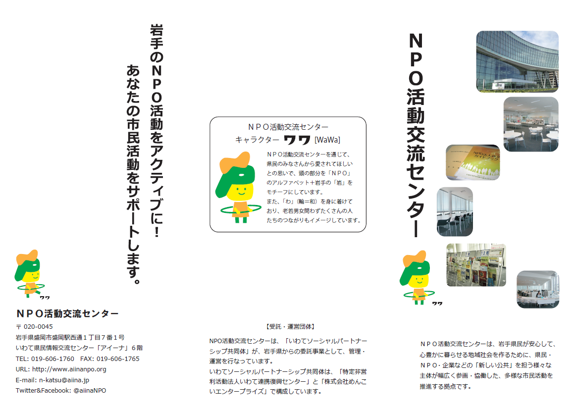 〒020-0045 盛岡市盛岡駅西通1丁目7番1号 いわて県民情報交流センター「アイーナ」6F NPO活動交流センター