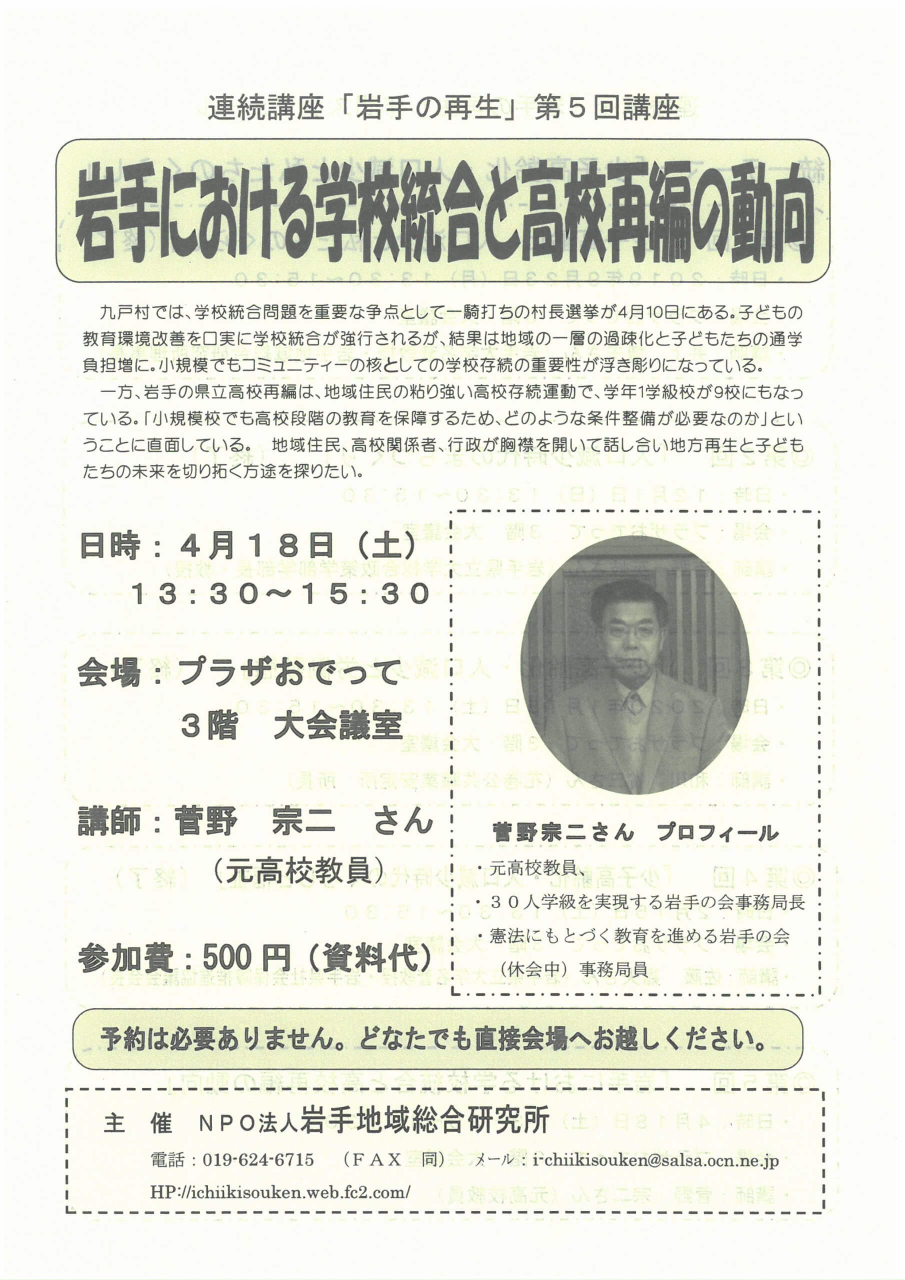 連続講座「岩手の再生」第5回講座『岩手における学校統廃合と高校再編の動向』