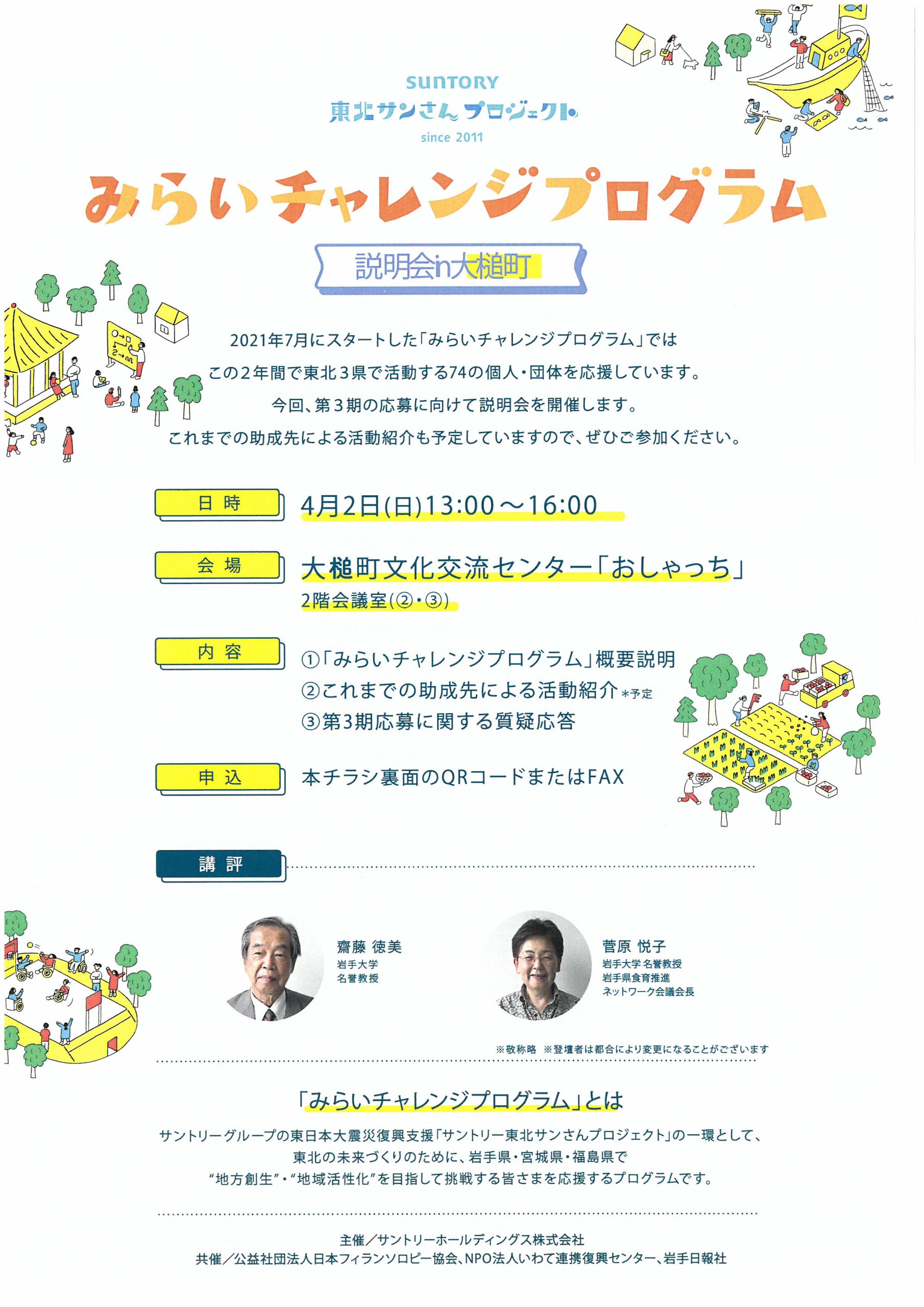 【助成金説明会】みらいチャレンジプログラムin 大槌(サントリー東北サンさんプロジェクト)