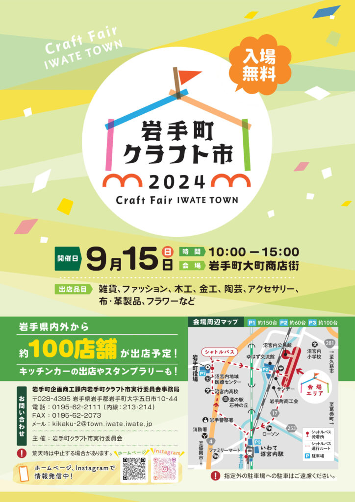 【日時】2024年9月15日(日)10:00~15:00 【会場】岩手町大町商店街 【出店内容】 ・雑貨 ・ファッション ・木工 ・金工 ・陶芸 ・アクセサリー ・布・革製品 ・フラワーなど 岩手県内外から約100店舗が出店予定!! キッチンカーの出店やスタンプラリーも! 【お問合せ・詳細】 岩手町企画商工課商工観光係 TEL:0195-62-2111(内線213、214)