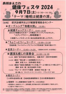 奥州まえさわ健康フェスタ2024「テーマ:睡眠は健康の源」(奥州市医療局) イベント・セミナー情報【県内】各種団体 2024/09/03 奥州まえさわ健康フェスタ2024「テーマ:睡眠は健康の源」 【日時】 2024年9月7日(土) 12:30~16:30 【会場】 前沢診療所および健康管理総合センター 【入場料】無料 *入場整理券が必要です(200名限定) 整理券は各地区センター、美希病院、前沢総合支所、前沢診療所にて配布します。 *上履きをご持参ください。 詳細は上記チラシをクリックしてご覧ください。