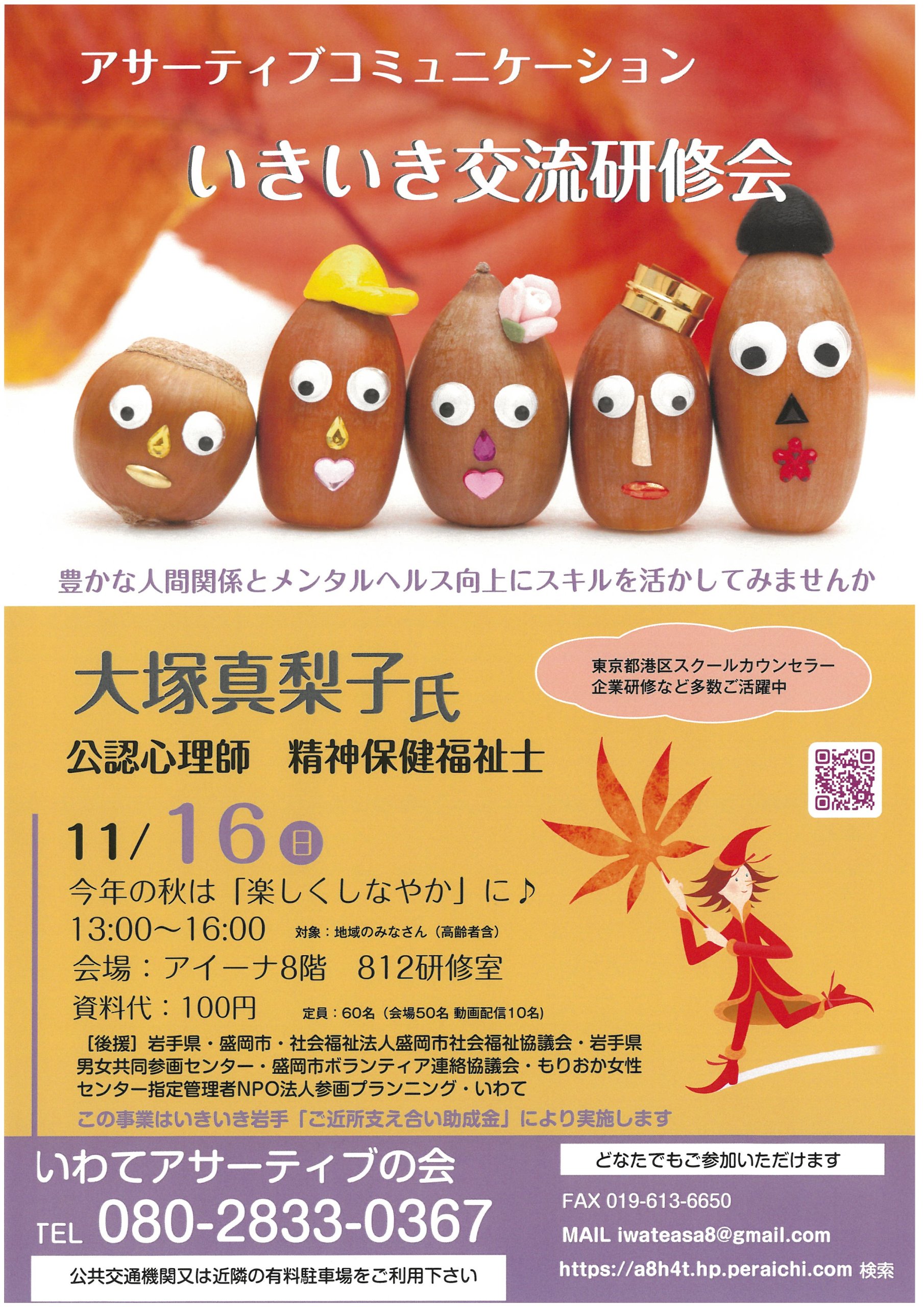 いきいき交流研修会(いわてアサーティブの会) イベント・セミナー情報【県内】各種団体 2025/09/26 豊かな人間関係とメンタルヘルス向上にスキルを活かしてみませんか 【対象】地域のみなさん(高齢者含む) 【日時】2025年11月16日(日) 13:00~16:00 【会場】アイーナ8階 812研修室 【資料代】100円 【定員】60名(会場50名 動画配信10名) 【詳細・お問合せ】 いわてアサーティブの会 080-2833-0367