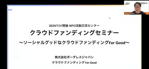 株式会社ボーダレスジャパン クラウドファンディングFor Good事業開発部の斎藤宏太さん(オンライン登壇)を講師に、