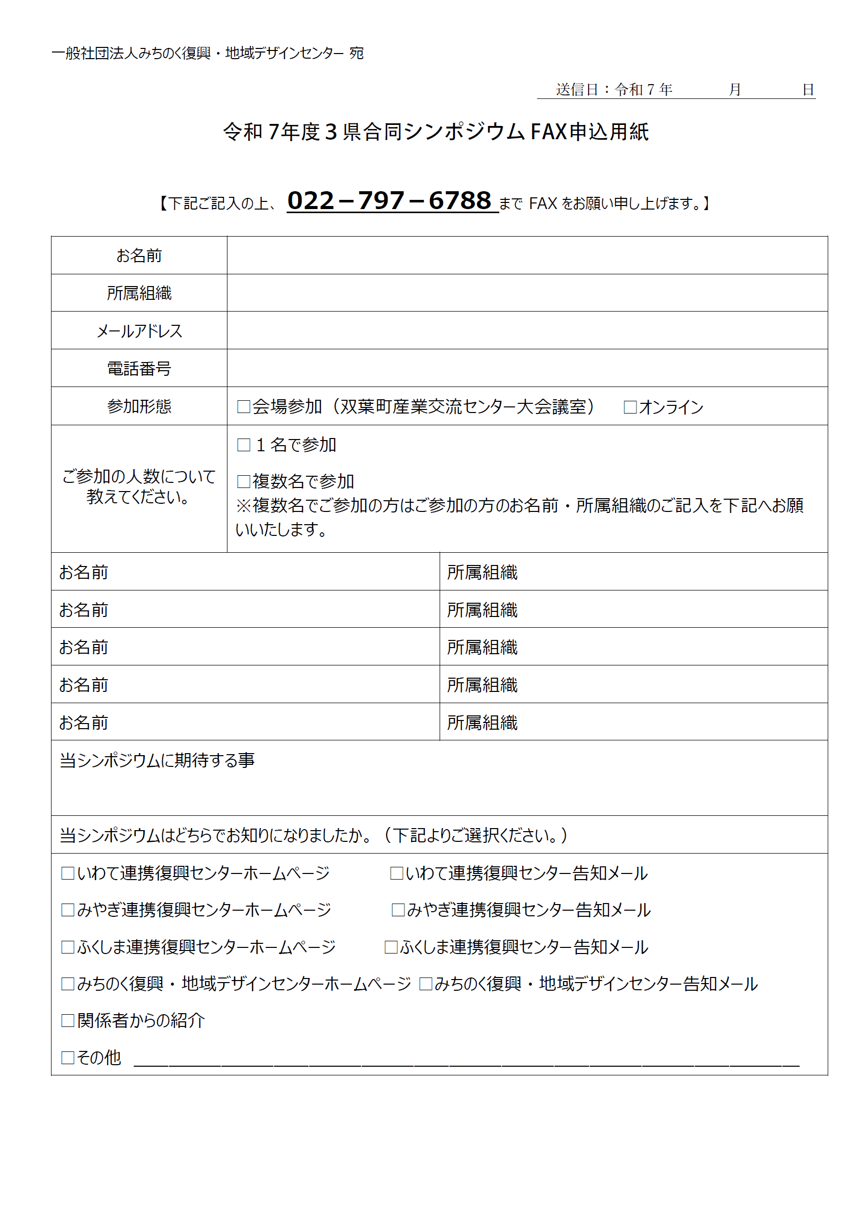 特定非営利活動法人 いわて連携復興センター、一般社団法人 みやぎ連携復興センター、一般社団法人 ふくしま連携復興センター、一般社団法人 みちのく復興・地域デザインセンター