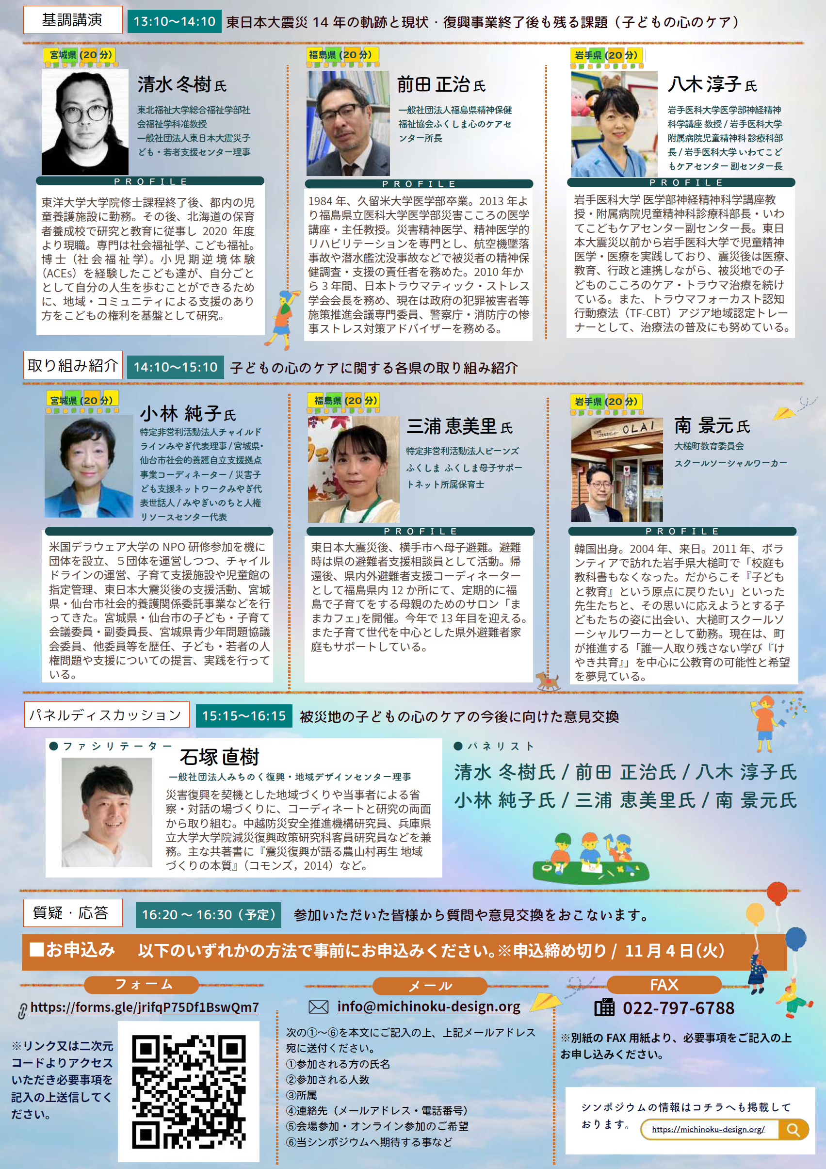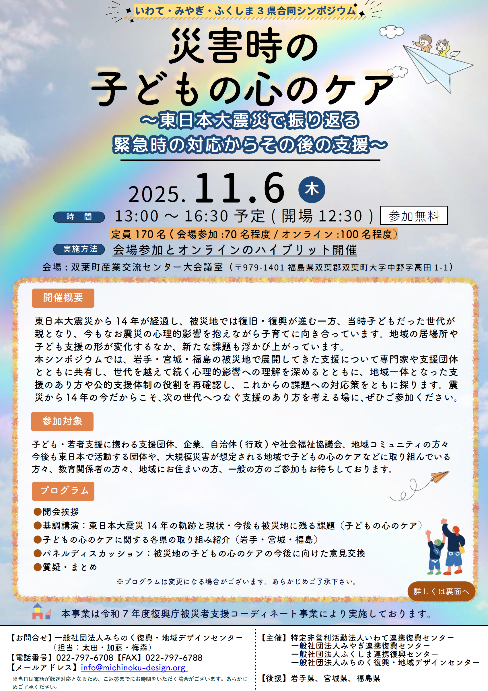 今回は「災害時の子どもの心のケア~東日本大震災で振り返る緊急時の対応からその後の支援~」と題して、東日本大震災から現在までの子どもの心のケアについての取り組み、今後の心のケアを取り巻く課題や必要な取り組みについて発信し、災害後に長期的な支援が必要となる背景と多様なセクターにより対応していく必要性について知り、登壇者や参加者が一緒に考える機会として実施します。