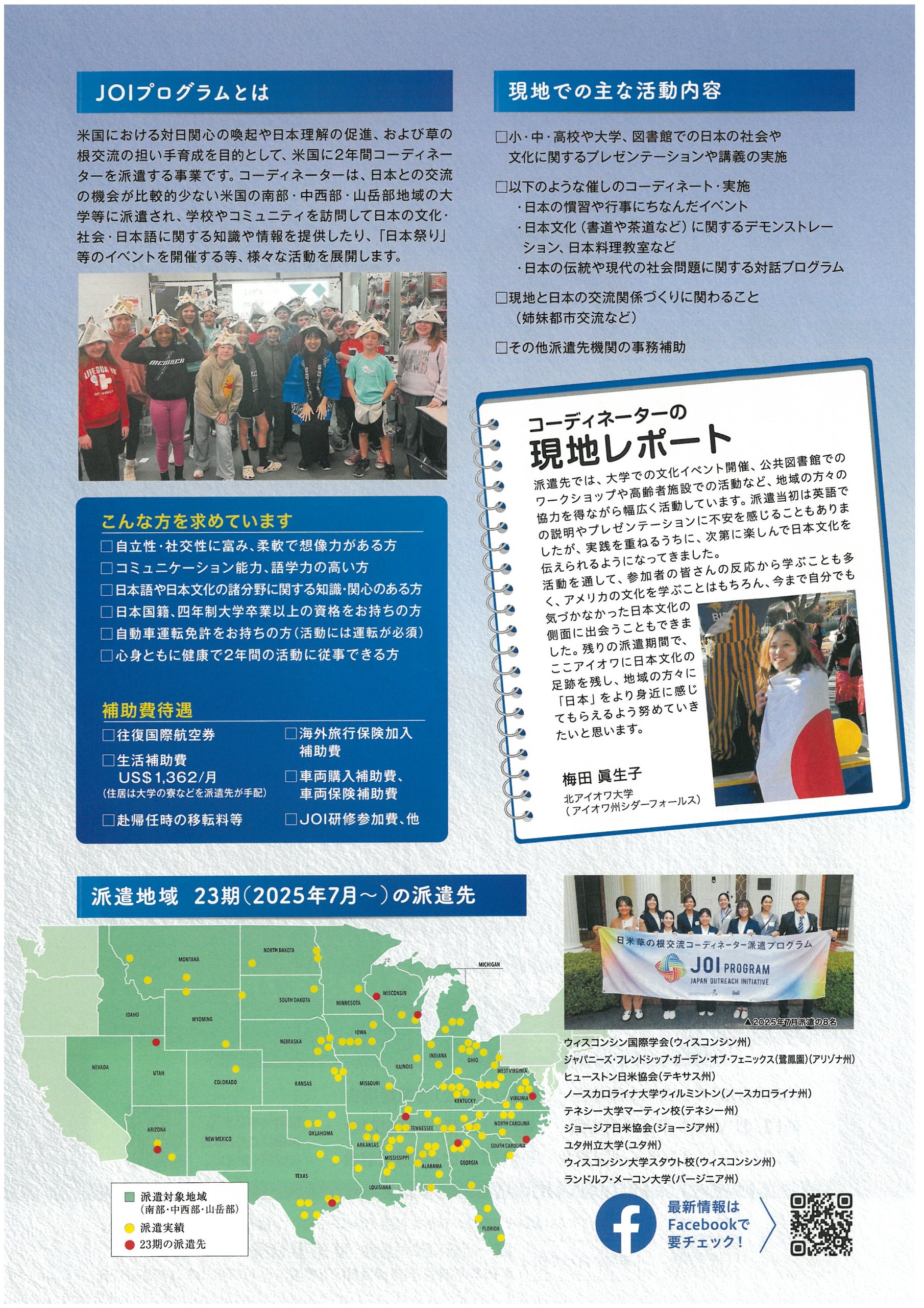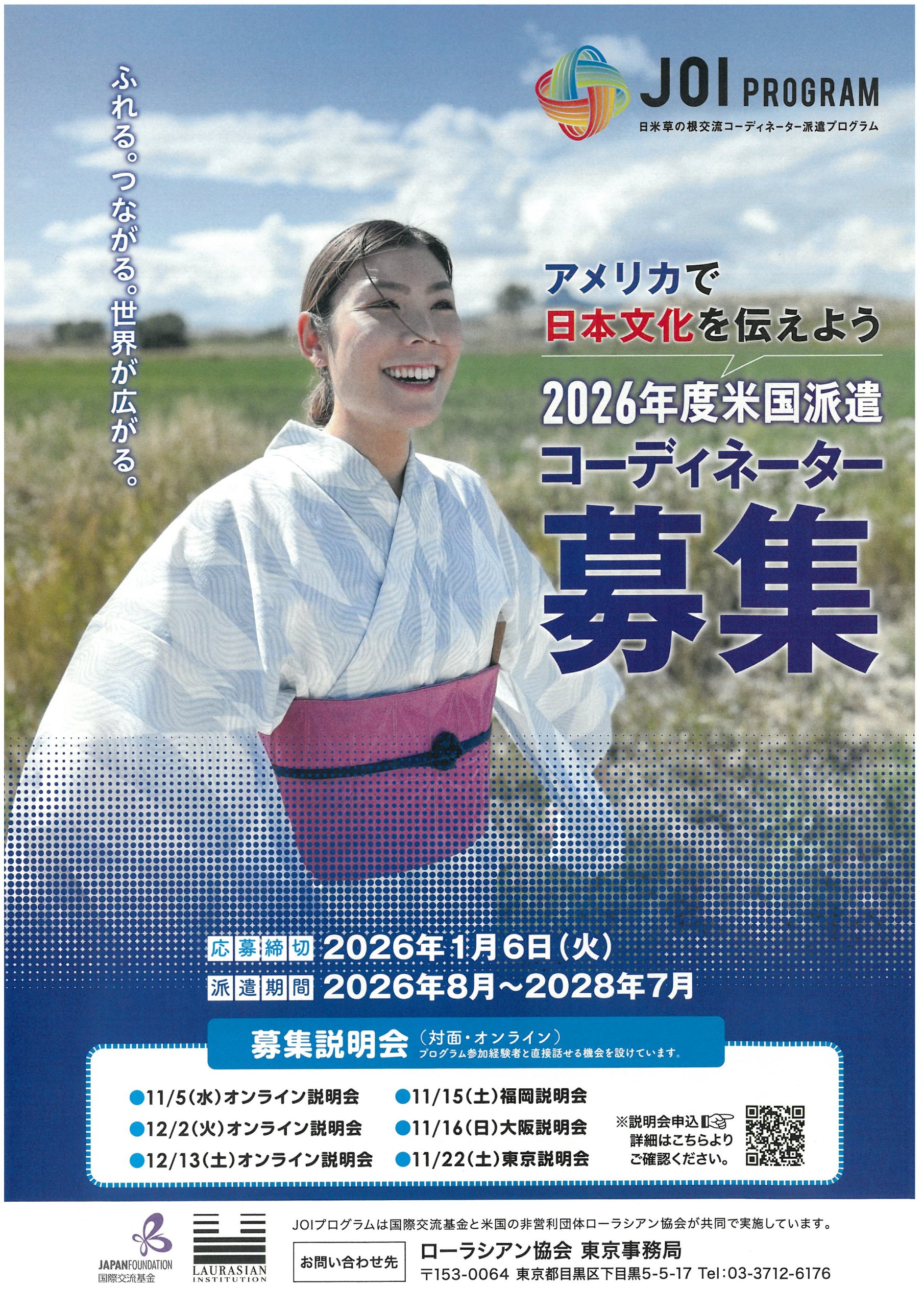国際交流基金とローラシアン協会では、米国における対日関心の喚起や日本理解の促進を目的として、日本人の草の根交流コーディネーターを2年間アメリカに派遣する「日米草の根交流コーディネーターJOI(Japan Outreach Initiative)プログラム」を実施しております。