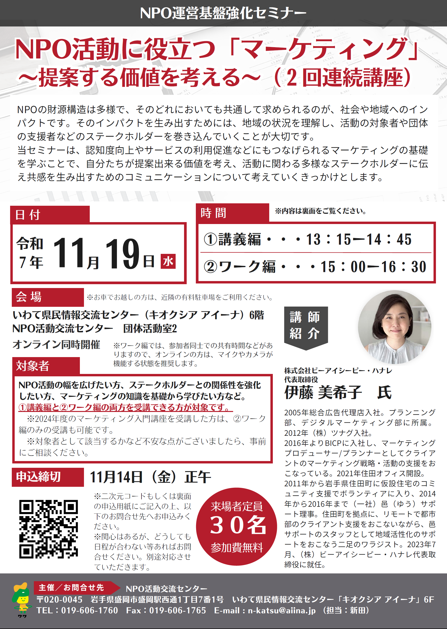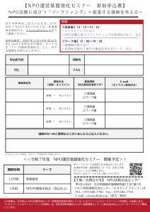 NPO運営基盤強化セミナー第3・4回:NPO活動に役立つ「マーケティング」~提案する価値を考える~(NPO活動交流センター)