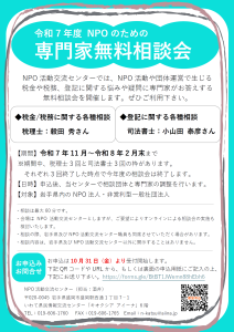 NPO活動交流センターでは、NPO活動や団体運営で生じる税金や税務、登記に関する悩みや疑問に専門家がお答えする無料相談会を開催します。ぜひご利用下さい。