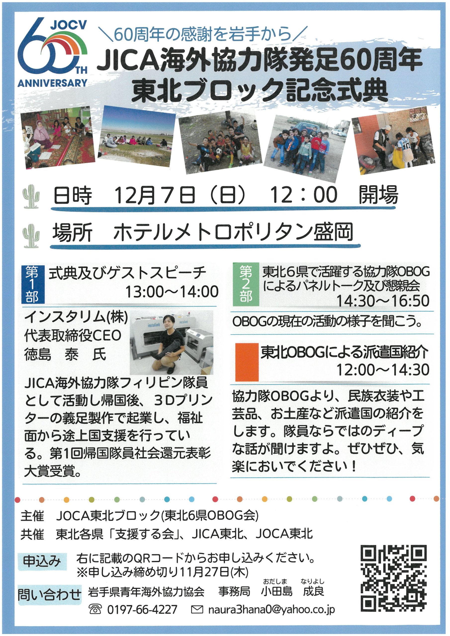 JICA海外協力隊発足60周年東北ブロック記念式典(岩手県青年海外協力協会) イベント・セミナー情報【県内】各種団体 2025/10/21 ~60周年の感謝を岩手から~ 【日時】2025年12月7日(日) 12:00開場 ●第一部 式典およびゲストスピーチ 13:00~14:00 ●第二部 東北6県で活躍する協力隊OBOGによるパネルトーク及び懇親会 14:30~16:50 ●東北OBOGによる派遣国紹介 12:00~14:30 【会場】ホテルメトロポリタン盛岡 【申込方法】上記画像のQRコードからお申し込みください。 【申込締切】2025年11月27日(木) 【お問合せ】 岩手県青年海外協力協会 (事務局連絡先は上記画像からご確認いただけます)