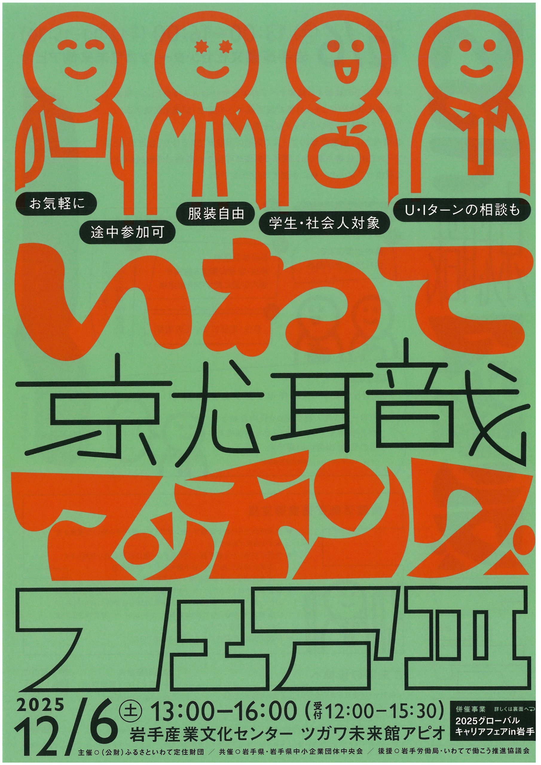 岩手県内での就職を目指すすべての学生や社会人を対象として、県内企業と学生等とのマッチング及び岩手県内への定住・定着を促進するため、「いわて就職マッチングフェアⅢ」を開催します。