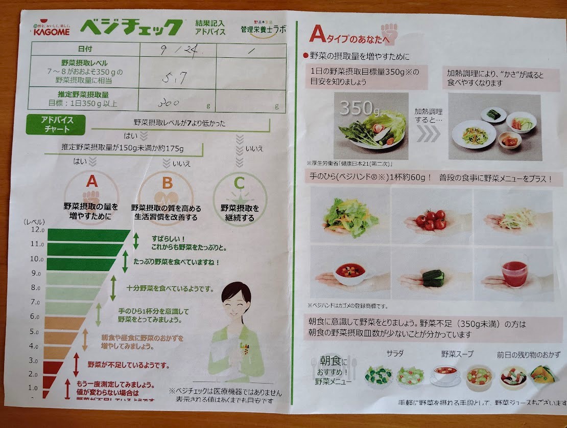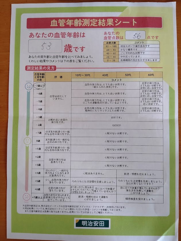 健康チェックが開催されることになったいきさつは、6月に開催された料理教室の時に、食生活改善推進委員の木村惠美子さんから、「男性の野菜の摂取量に懸念が感じられる。野菜の摂取量が数字でわかる測定器があるので測定の機会を作りたい」とご提案があり、社協 生活支援コーディネーター三田地駿さんからNPO活動交流センターにご相談がありました。そこで、明治安田が取り組んでいる「地元の元気プロジェクト」の健康チェックをご紹介したところ、ぜひ明治安田さんとおつなぎいただき測定会を開きたいとご要望があり、8月に両者の顔合わせと意見交換から具体的な検討と準備を進め、9月のメンズ教室で実現することができました。今回健康チェックとして実施したのは「ベジチェック」と「血管年齢チェック」です。測定後には明治安田のスタッフから個別に測定結果シートを発行していただき、シートの見方などを説明していただきました。