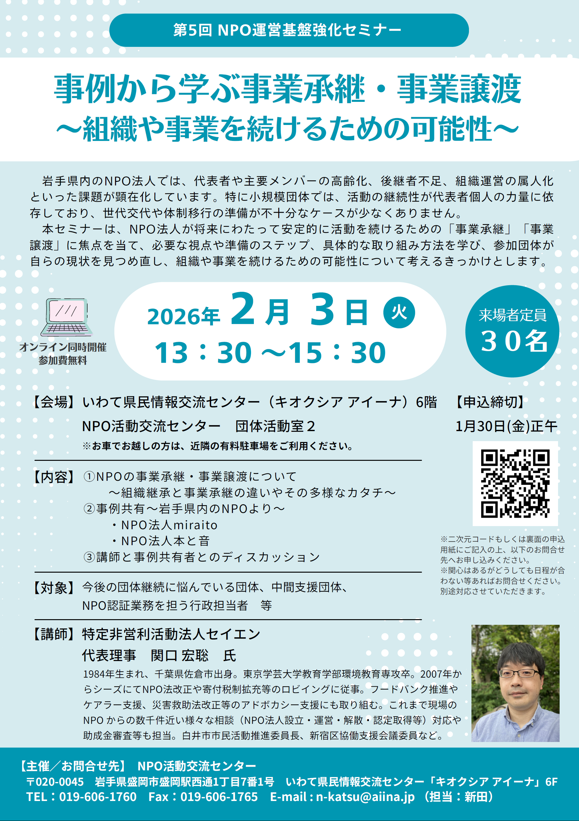 【NPO運営基盤強化セミナー第5回】2/3開催:事例から学ぶ事業継承・事業譲渡~組織や事業を続けるための可能性~(NPO活動交流センター)