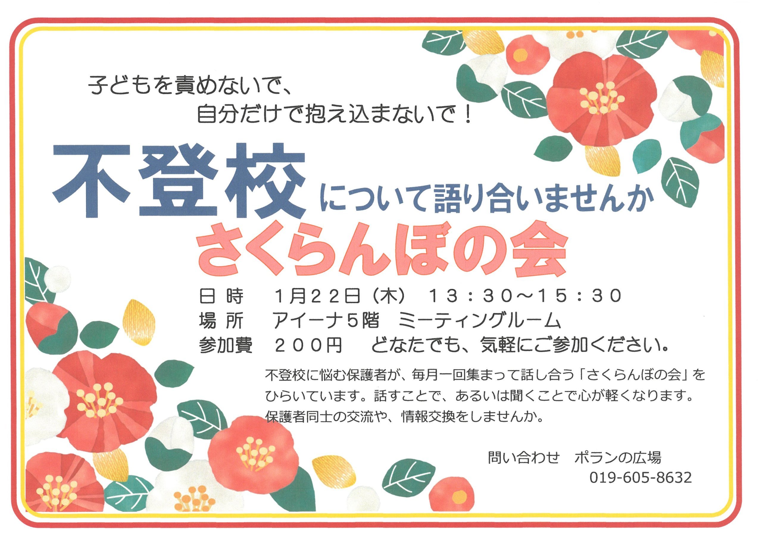 不登校に悩む保護者が、毎月一回集まって話し合う「さくらんぼの会」をひらいています。