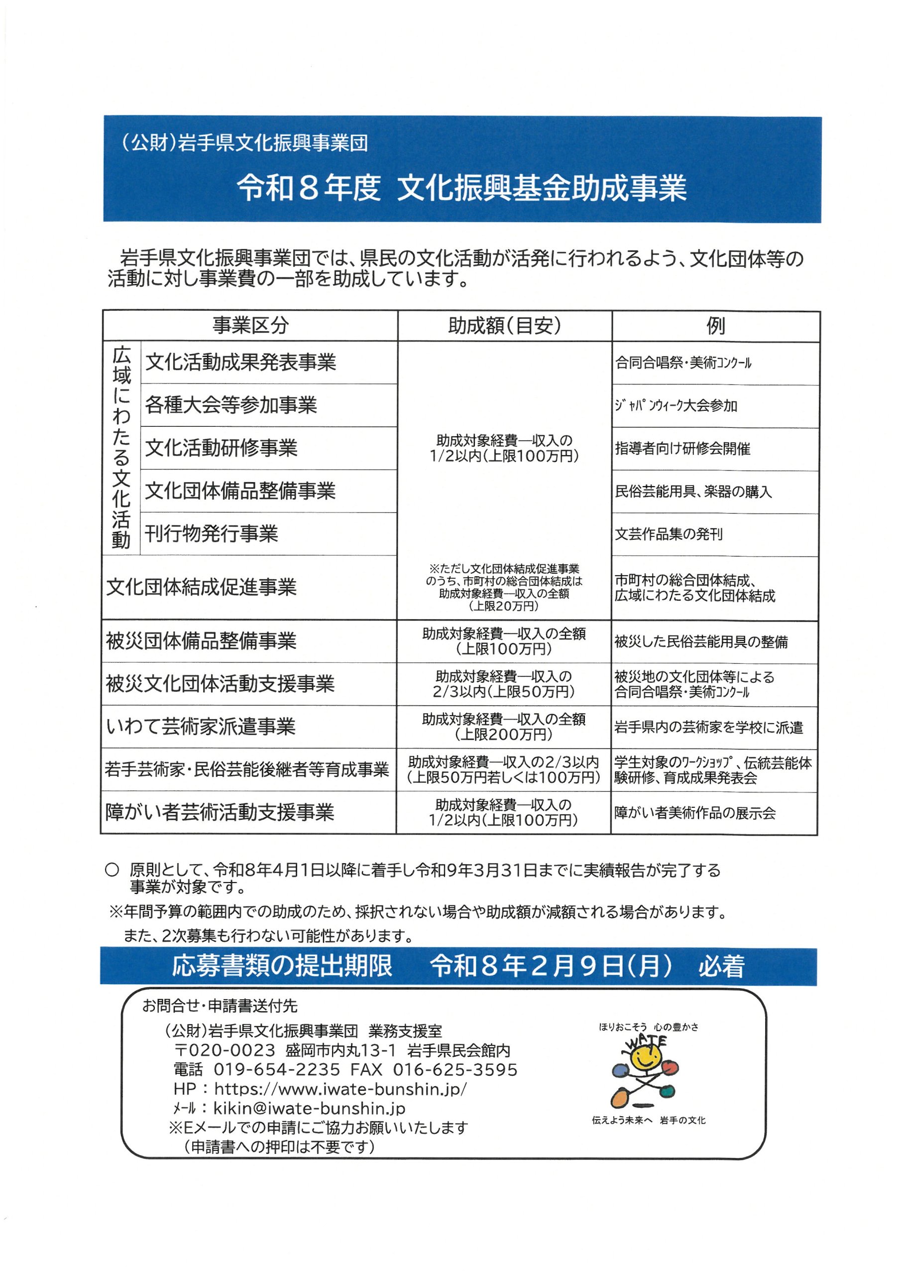 【助成金】令和8年度文化振興基金事業(岩手県文化振興事業団)