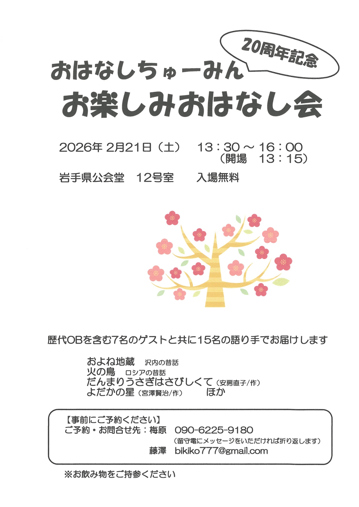 お楽しみおはなし会(おはなしちゅーみん) イベント・セミナー情報 2026/01/29 歴代OBを含む7名のゲストと共に15名の語り手でお届けします およね地蔵 火の鳥 だんまりうさぎはさびしくて よだかの星 ほか 【日時】2026年2月21日(土) 13:30~16:00(開場13:15) 【会場】岩手県公会堂 12号室 【入場料】無料 【ご予約・お問合せ】※事前にご予約下さい おはなしちゅーみん 梅原:090-6225-9180 藤澤:bikiko777@gmail.com