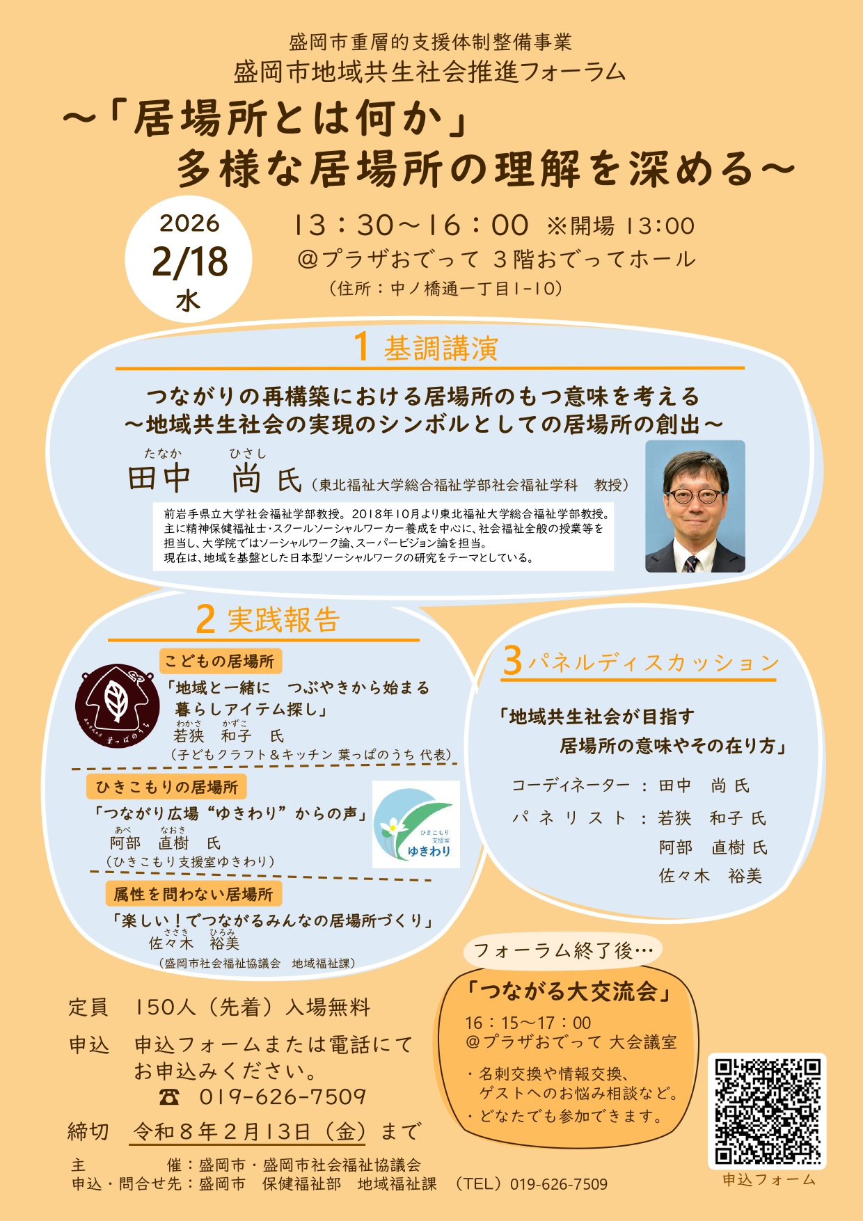 「居場所とは何か」多様な居場所の理解を深める(盛岡市社会福祉協議会) イベント・セミナー情報 2026/02/02 盛岡市重層的支援体制整備事業 盛岡市地域共生社会推進フォーラム ~「居場所とは何か」多様な居場所の理解を深める~ 【日時】2026年2月18日(水)13:30~16:00 ※開場13:00 【会場】プラザおでって 3階おでってホール 【定員】150人(先着) 入場無料 【申込】申込フォーム(上記チラシにQRコードがあります)または電話にてお申込みください。 TEL 019-626-7509 【締切】2026年2月13日(金)まで 【申込・問合せ】盛岡市 保健福祉部 地域福祉課 TEL 019-626-7509
