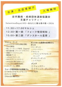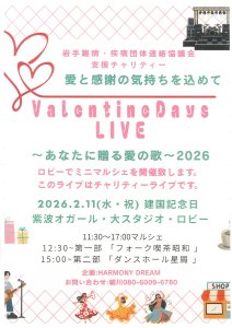 岩手難病・疾病団体連絡協議会支援チャリティー ValentineDaysLIVE(HarmonyDream) イベント・セミナー情報【県内】各種団体 2026/02/05 愛と感謝の気持ちを込めて~あなたに贈る愛の歌~2026 ロビーでミニマルシェを開催します。 このライブはチャリティーライブです。 詳細は上記画像をクリックしてご覧ください。 【日時】2026年2月11日(水・祝) 11:30~17:00 マルシェ 12:00~ 第一部「フォーク喫茶昭和」 15:00~ 第二部「ダンスホール星屑」 【会場】紫波オガール・大スタジオ・ロビー 【入場】無料 【お問合せ】 HarmonyDream(連絡先は上記画像をご確認ください)