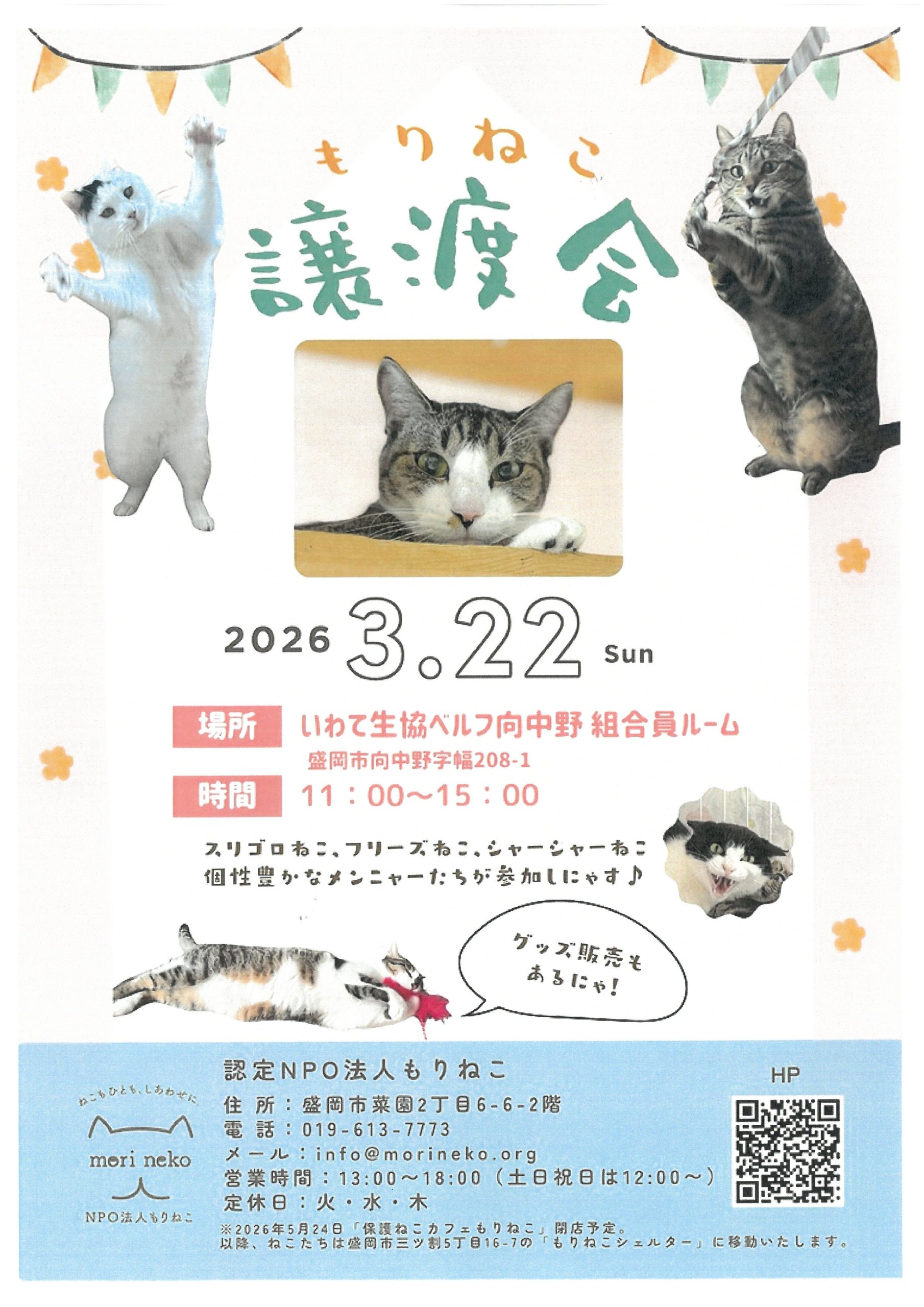 もりねこ譲渡会(もりねこ) イベント・セミナー情報【県内】NPO法人 2026/02/13 【日時】 2026年3月22日(日) 11:00~15:00 【場所】 いわて生協ベルフ向中野 組合員ルーム (盛岡市向中野字幅208-1) 【お問い合わせ】 認定NPO法人もりねこ 電話:019-613-7773
