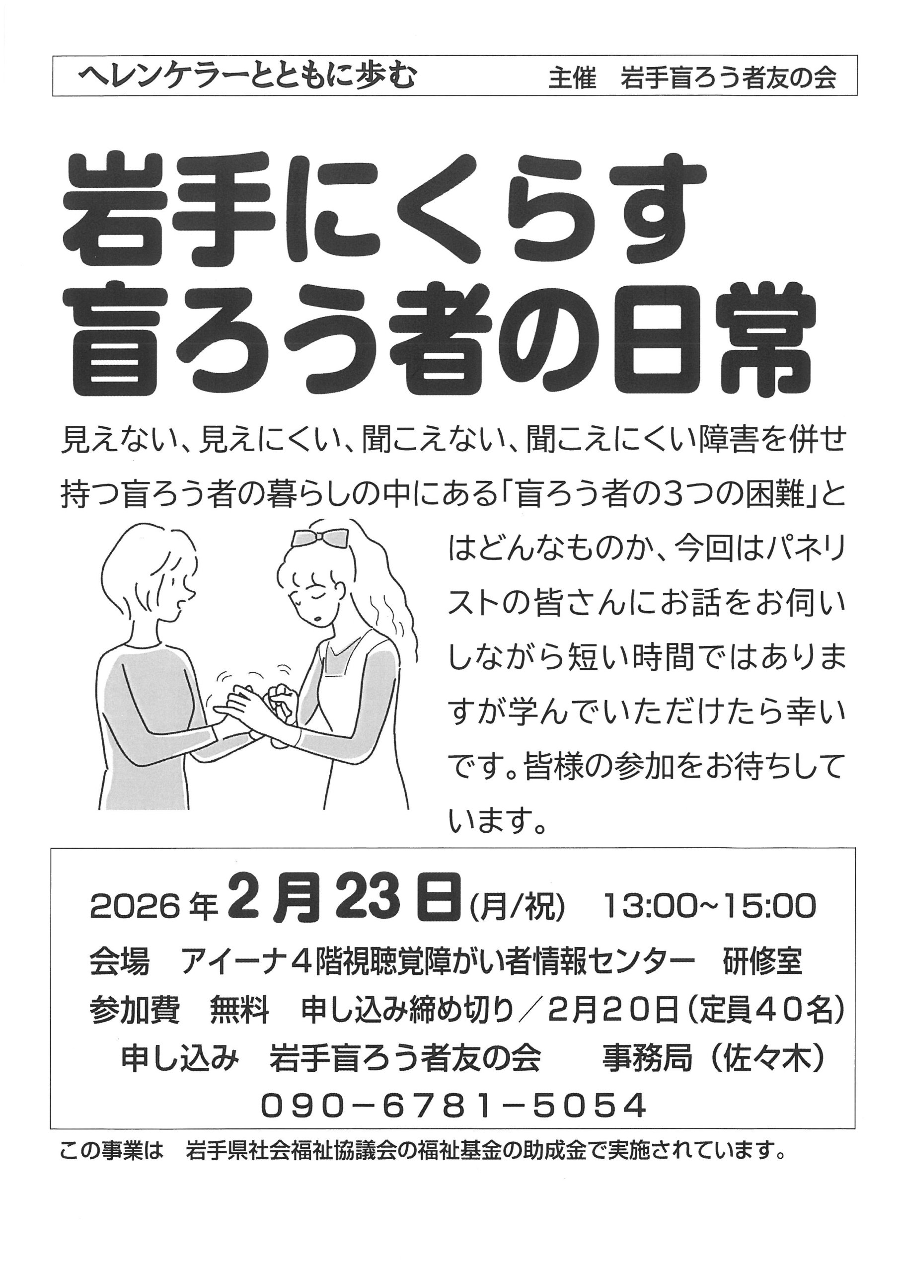 岩手にくらす盲ろう者の日常(岩手盲ろう者友の会) イベント・セミナー情報 2026/02/15 盲ろう者の暮らしの中にある「盲ろう者の3つの困難」とはどんなものか、パネリストの皆さんにお話しをお伺いしながら学んでいただけたら幸いです。 【日時】2026年2月23日(月祝) 13:00~15:00 【会場】キオクシアアイーナ4階視聴覚障がい者情報センター 研修室 【参加費】無料 【定員】40名 【申込締切】2026年2月20日 【詳細・お問合せ】 岩手盲ろう者友の会 事務局(佐々木) 090-6781-5054