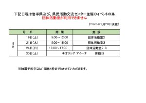 なお、下記の日程は岩手県及び県民活動交流センター主催イベントのため団体活動室が利用できません。