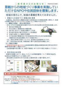 本事業は、県が身近な景観を点検する取組をNPOや地域住民等に委託して、地域の景観を見直すきっかけとすることを狙いとして実施するものです。