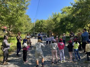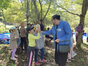 自己紹介とラジオ体操から始まり、グループに分かれてのゲームやトレジャーハンティング、フリータイム、おにぎりづくりと自然散策など盛りだくさんです。最初は輪に入ることをためらう子や大勢と交わるのは苦手な印象のある子も、プログラムを進めながら自然に馴染んでいく様子が見られました。