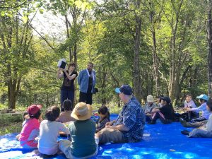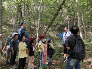 遠野市役所に集合しバスで遠野森のがっこうに到着した子どもたちに、講師たちはプログラムが始まる前から自然に話しかけながら溶け込んでいきます。