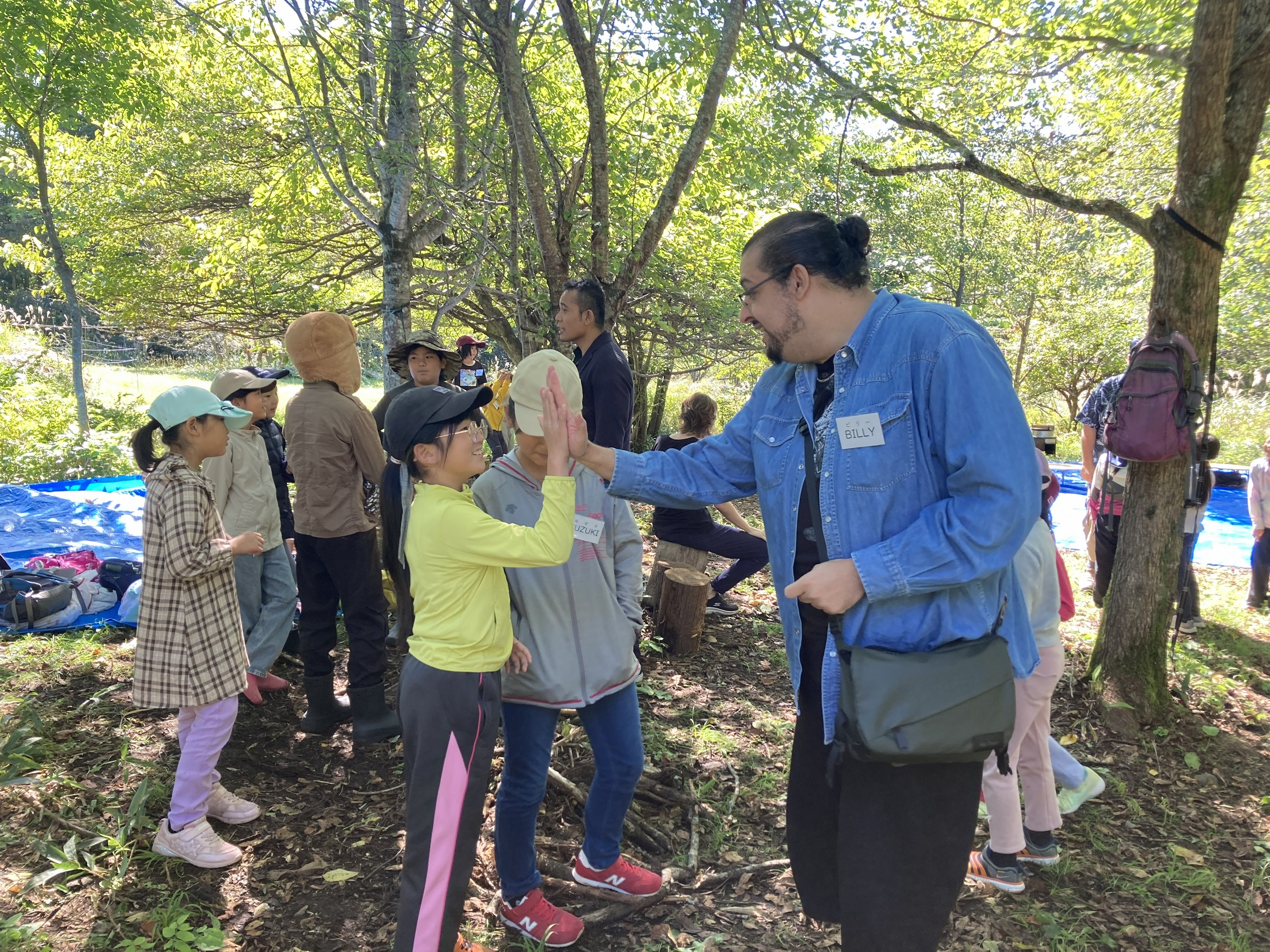 遠野市役所に集合しバスで遠野森のがっこうに到着した子どもたちに、講師たちはプログラムが始まる前から自然に話しかけながら溶け込んでいきます。