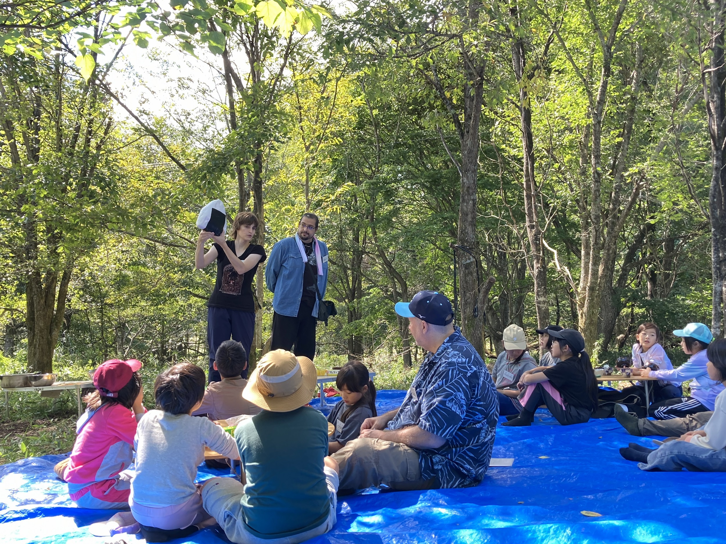 自己紹介とラジオ体操から始まり、グループに分かれてのゲームやトレジャーハンティング、フリータイム、おにぎりづくりと自然散策など盛りだくさんです。最初は輪に入ることをためらう子や大勢と交わるのは苦手な印象のある子も、プログラムを進めながら自然に馴染んでいく様子が見られました。