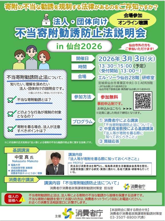 法人・団体向け不当寄附勧誘防止法説明会 in 仙台2026(消費者庁)
