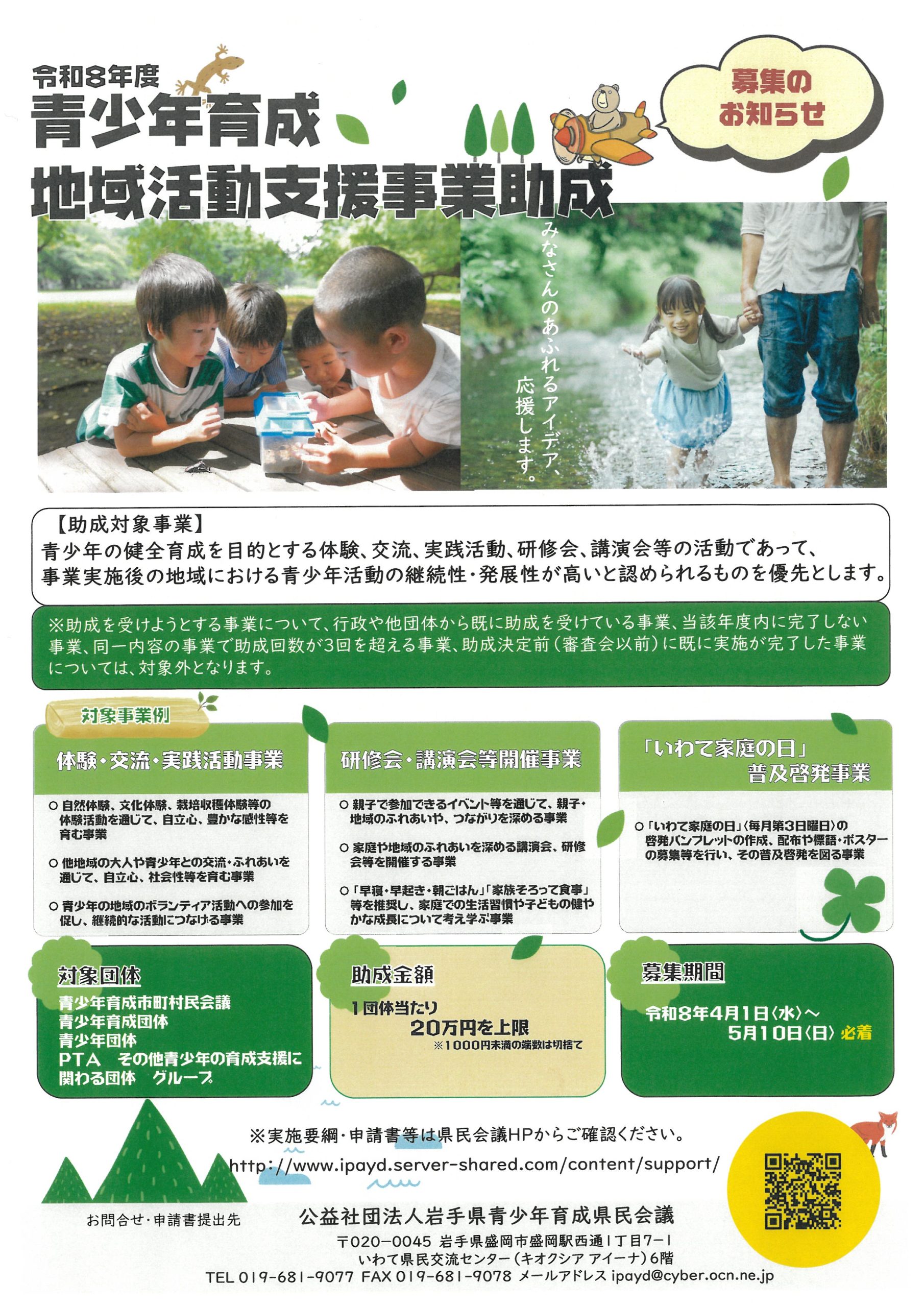 【助成金】令和8年度青少年育成地域活動支援事業助成(岩手県青少年育成県民会議)