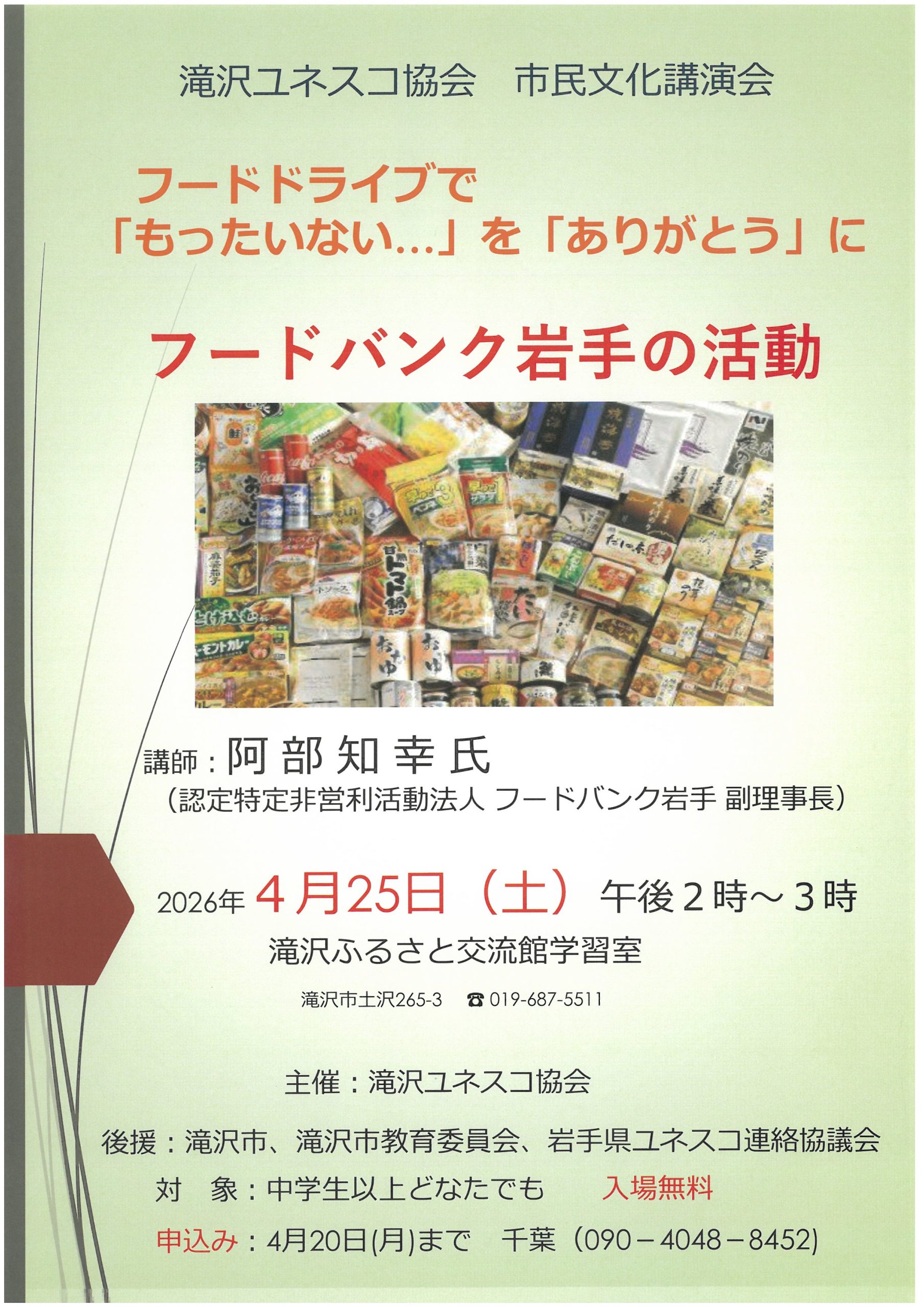 滝沢市民文化講演会(滝沢ユネスコ協会) イベント・セミナー情報 2026/03/09 滝沢ユネスコ協会市民文化講演会 フードドライブで「もったいない」を「ありがとうに」フードバンク岩手の活動 講師 阿部 知幸 氏(認定特定非営利法人フードバンク岩手副理事長) 【日時】 2026年4月25日(土) 14:00~15:00 【会場】 滝沢ふるさと交流館学習室 【入場料】 無料 【申し込み】 4月20日(月)まで 中学生以上どなたでも 【申し込み・お問合せ】 千葉(090-4048-8452)