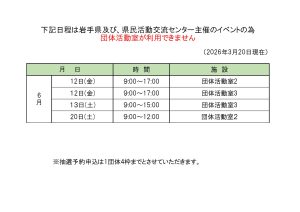 なお、下記の日程は岩手県及び県民活動交流センター主催イベントのため団体活動室が利用できません。