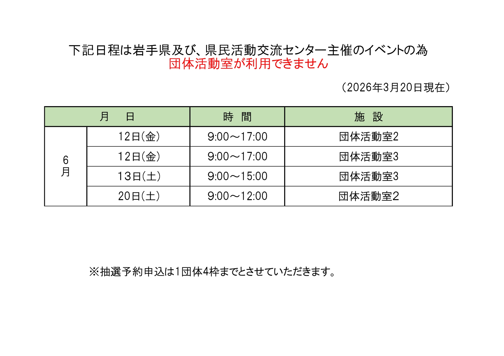 なお、下記の日程は岩手県及び県民活動交流センター主催イベントのため団体活動室が利用できません。