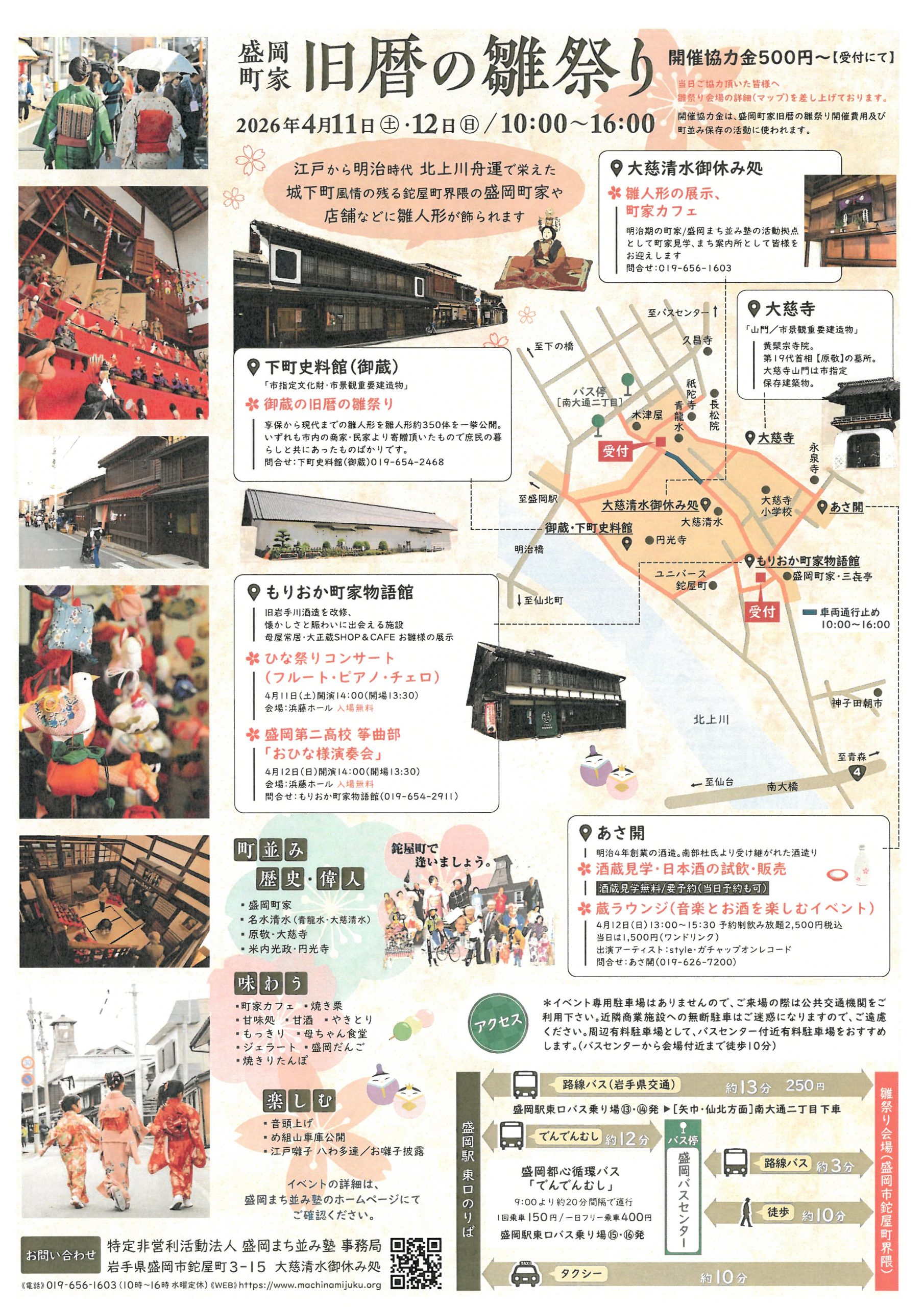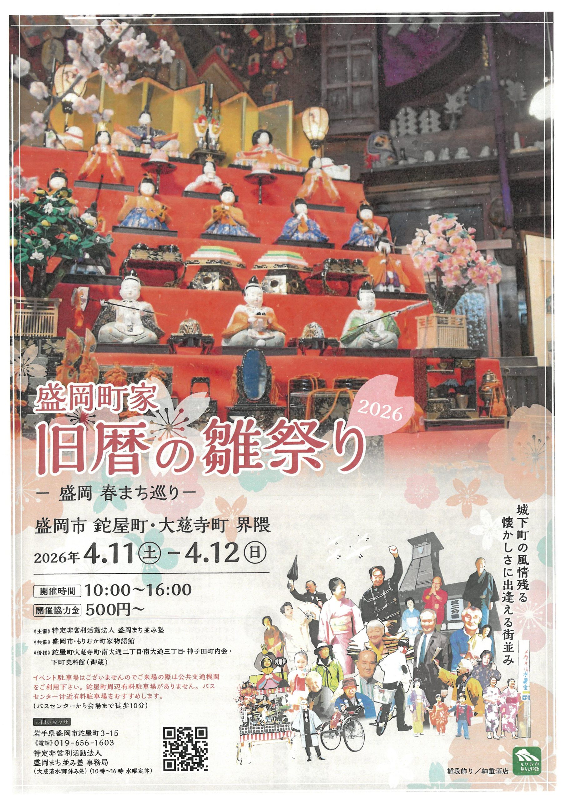 盛岡市鉈屋町で行われる『盛岡町家旧暦の雛祭り』を楽しみませんか? 【日時】2026年4月11日(土)~12日(日)10:00~16:00 【会場】盛岡市鉈屋町 【開催協力金】500円~ 【お問合せ先】 特定非営利活動法人 盛岡まち並み塾